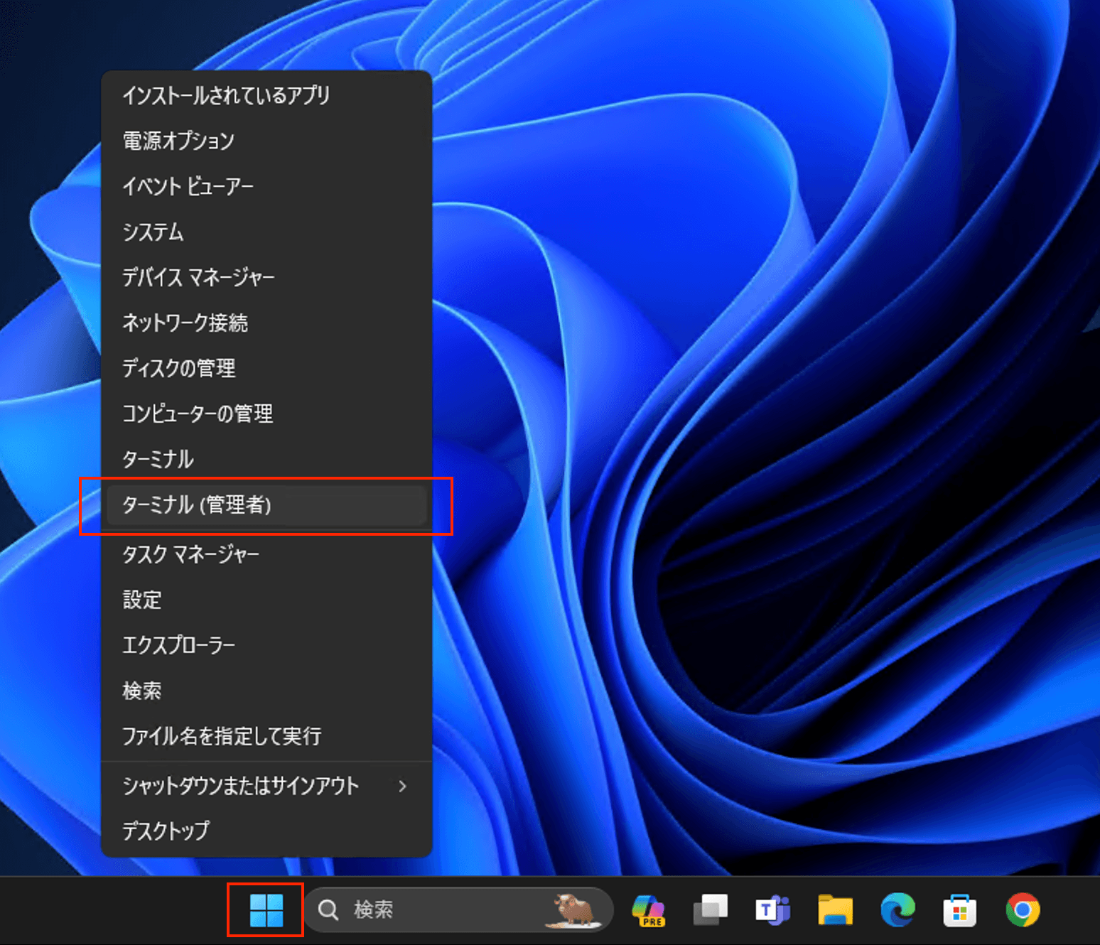 以下のように、スタートメニュー上で右クリックすると、ターミナル(管理者)というメニューがあるのでこれをクリックします。