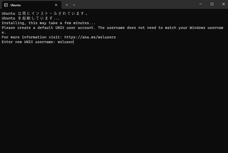 Windows11 を再起動後、少しすると以下のようターミナルが表示されて、Ubuntu のユーザー名を入力するよう指示されます。ここで入力するユーザー名は Windows のユーザー名と一致する必要はなく、新しい独自のもので OK です。ここでは適当にwsluserとしました。