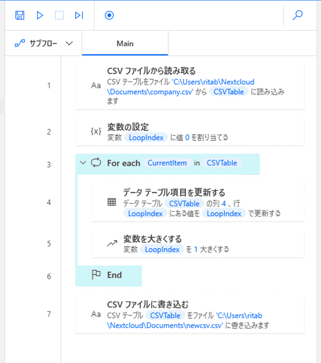 ...çç¥...ã«ãŒãåŠçã䜿ã£ãŠèªã¿èŸŒãã CSV ãã¡ã€ã«ã®ããŒã¿ã®åè¡ã«å¯ŸããŠé çªã«åŠçãè¡ããåè¡ã®è¡çªå·åã«è¡çªå·ã远èšããã ãã® CSV ãã¡ã€ã«ã Power Automate Desktop ã§äœæããããšããã®èšäºã®ãŽãŒã«ã§ãã