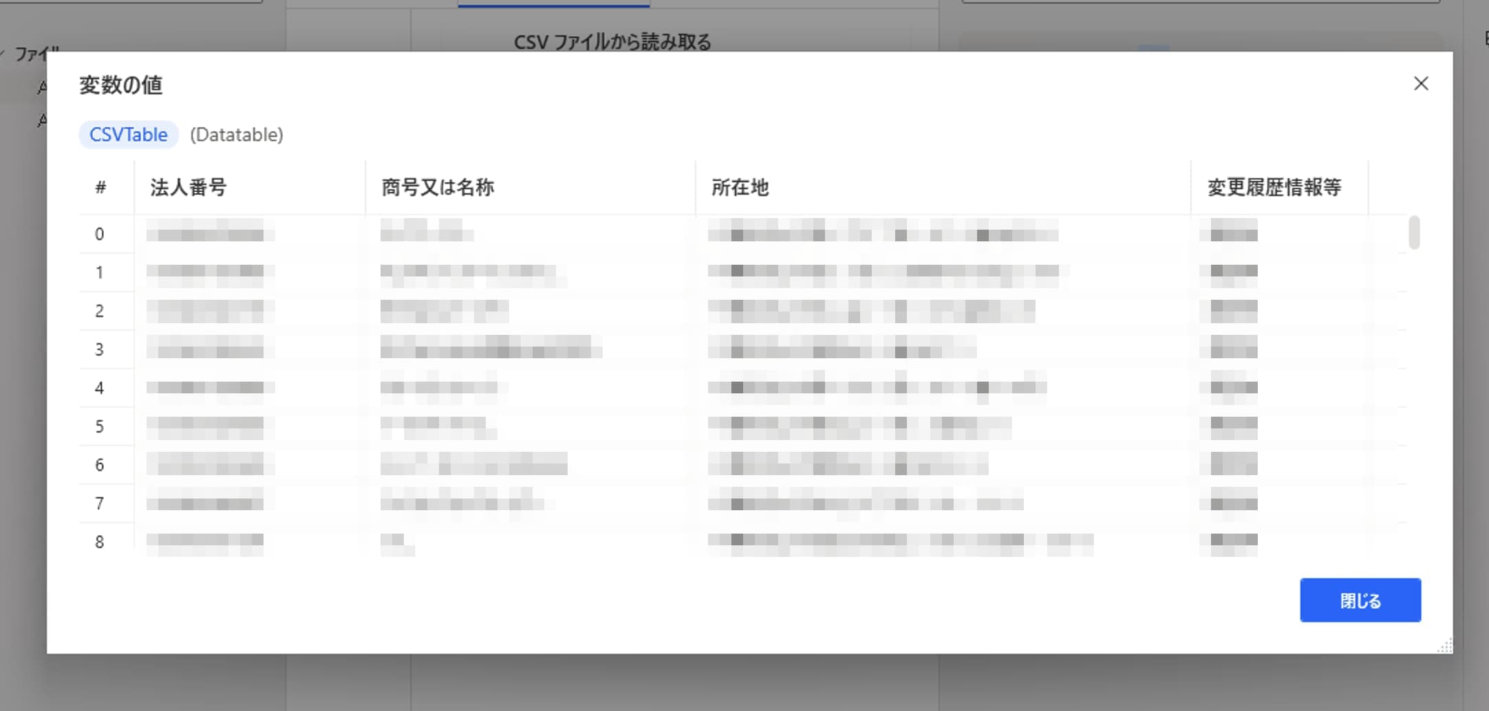 ã«ããCSVTableãããã«ã¯ãªãã¯ãããšã 以äžã®ããã«äžèº«ã確èªã§ããŸããä»å䜿çšããŠãã