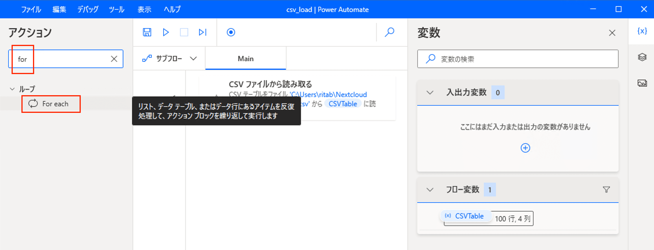 èªã¿èŸŒãã CSV ãã¡ã€ã«ã®ããŒã¿ãæ ŒçŽãããCSVTableã®åè¡ã«å¯ŸããŠã«ãŒãåŠçãè¡ããŸãã以äžã®ããã«ãforãšæ€çŽ¢ããŠè¡šç€ºãããFor eachãããã«ã¯ãªãã¯ããŸãã