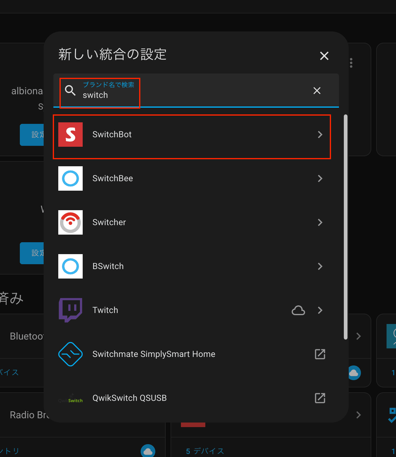 統合を追加すると以下のような画面が表示されるので「SwitchBot」を検索し、結果に表示される「SwitchBot」をクリックします。